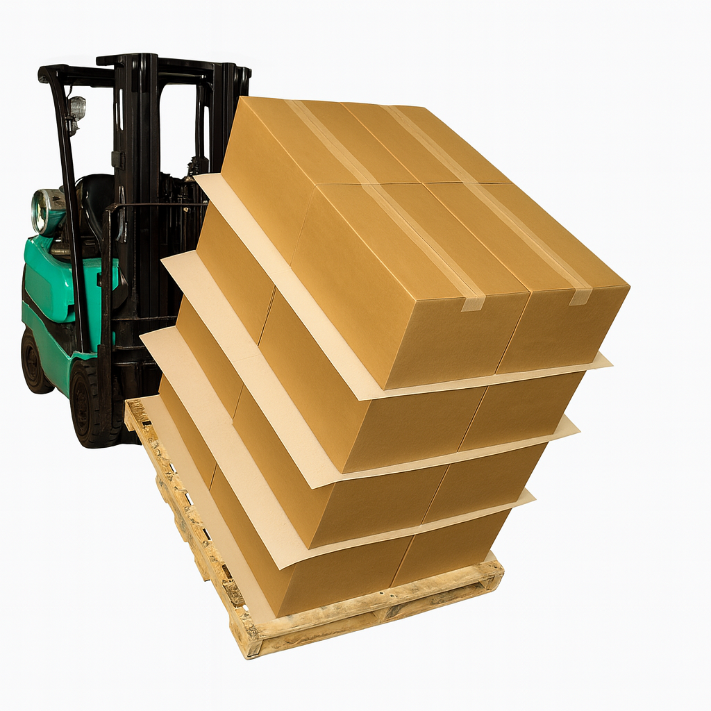 This grade of paper offers a much better yield and level of consistency versus other products such as Chipboard or Gypsum Board. It is most used as a pallet liner or tie sheet to stabilize products packed on a pallet. This product can be used manually or with automatic placement or pick-up systems (vacuum pick-up).